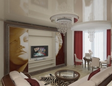 Интерьер реализован в мягких пастельных тонах – цвета ванили, шоколада и вишни. Окна до пола наполняют помещение светом и воздухом. Тенденция последнего времени – использование максимального количества натуральных материалов – была реализована в данной квартире – паркет, декоративная штукатурка, деревянная мебель. Красивые итальянские люстры подчеркивают роскошь и прекрасно дополняют созданный интерьер.