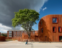 Комплекс состоит из пяти небольших корпусов, объединенных характерным фасадом из вертикальных планок. Его структура делает отсыл к особенностям местной архитектуры, а рыжий оттенок поддерживает кирпичные фасады окружающих построек.