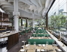 Известная лондонская архитектурная дизайн-студия интерьера David Collins Studios Website представила дизайн интерьера ресторана Continental, Передающего сложные дух европейского кафе на Pacific Place, Hong Kong S.A.R., Китай. Автономное здание ресторана, спроектированное студией Heatherwick, является уникальным примером современной архитектуры. После открытия в 2008 году внушительная конструкция здания со скульптурными потолками привлекла внимание мирового дизайнерского сообщества. В переосмысление интерьера ресторана, Дэвид Коллинз, храня инновационные решения и современность здания, ввел элементы, дополняющие оригинальный дизайн. «Учитывая волнообразные кривые здания, — говорит Дэвид Коллинз, — мы ввели чувство однородности в макет. В другом месте, мы создали лентообразную фреску, чтобы отразить знаковую форму здания.» Дэвид Коллинз предложил также пересмотреть компоновку внутренних помещений, чтобы увеличить вместить ресторана до 120 мест и создать дополнительно небольшой бар на входе. Автор подчеркнул широкие окна и создал уютный уголок для пар и небольших групп.